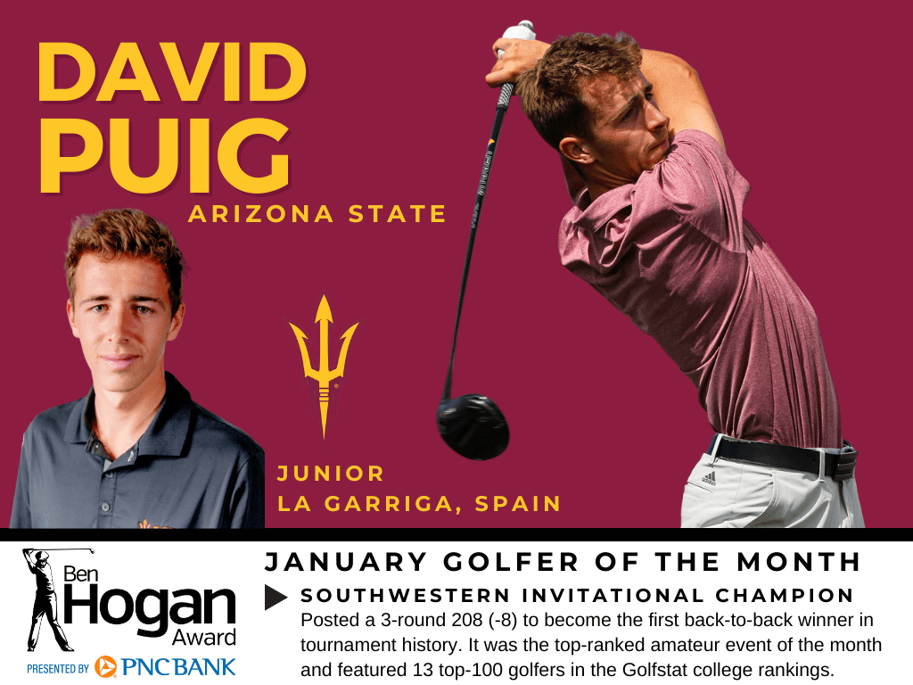 FORT WORTH, Texas (Feb. 17, 2022) — Arizona State’s David Puig has been named the January Ben Hogan Award presented by PNC Bank Golfer of the Month. He is the second Sun Devil to claim the honor this season, joining September winner Cameron Sisk.