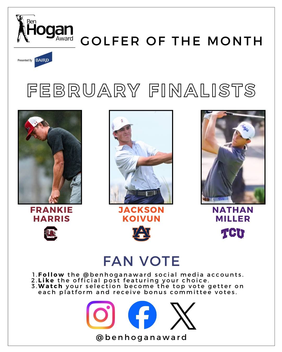 FORT WORTH, Texas (March 17, 2026) – South Carolina’s Frankie Harris, Auburn’s Jackson Koivun and TCU’s Nathan Miller have been named the three finalists for the Ben Hogan Award’s February Golfer of the Month accolade.